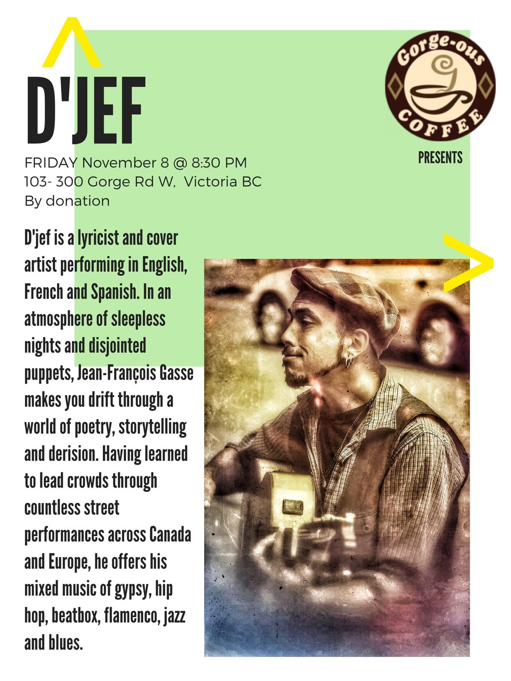 D'jef is a lyricist and cover artist performing in English, French and Spanish. In an atmosphere of sleepless nights and disjointed puppets, Jean-François Gasse makes you drift through a world of poetry, storytelling and derision. Having learned to lead crowds through countless street performances across Canada and Europe, he offers his mixed music of gypsy, hip hop, beatbox, flamenco, jazz and blues.
