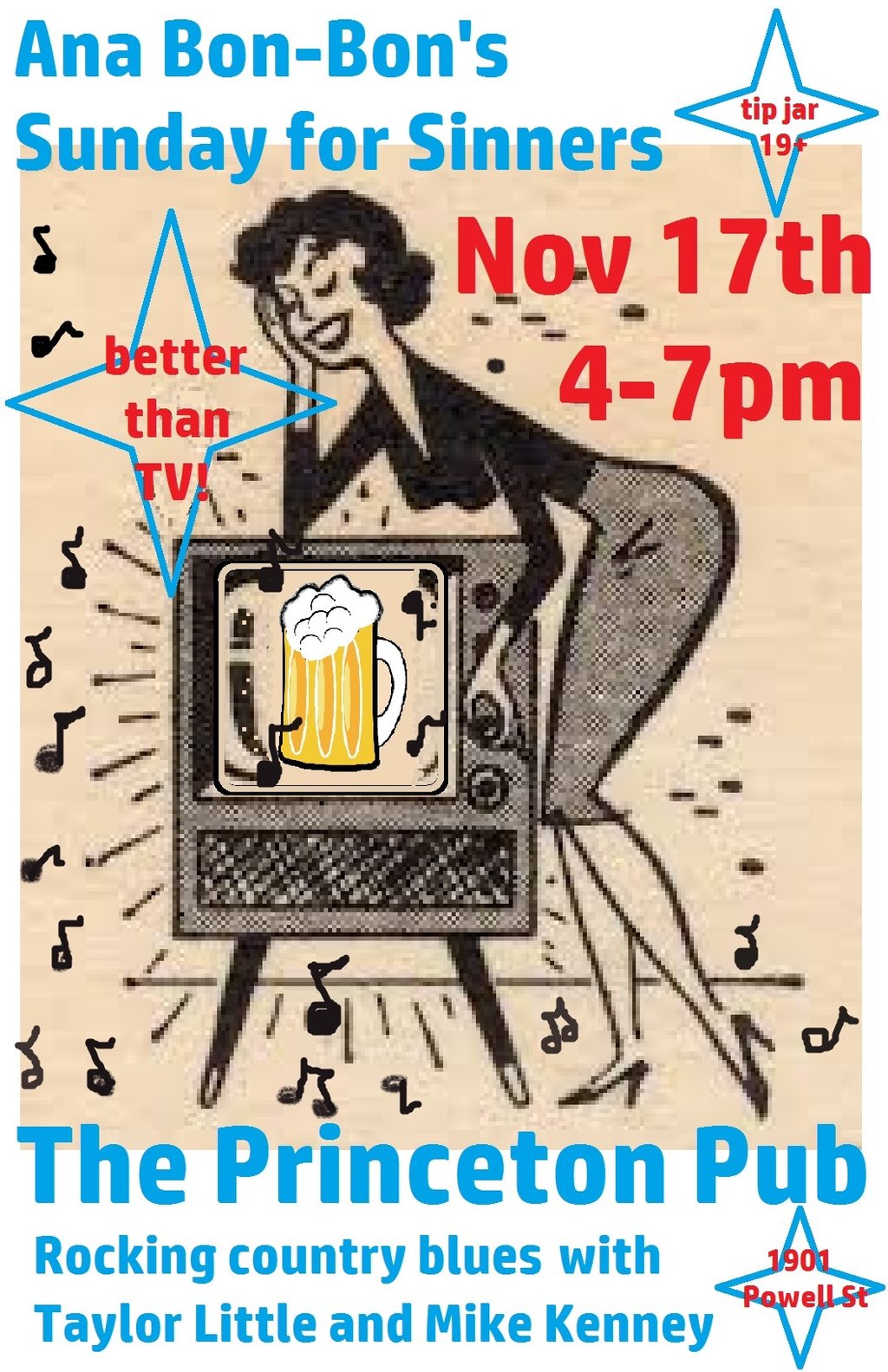 Blues Cabaret chanteuse Ana Bon-Bon performs rocking country blues with drummer Taylor Little and guitarist Mike Kenney at the cozy, friendly, historic Princeton Pub's long-running monthly musical saloon and social! ...with Very special guests! Trains! Pool Table! Rotating Craft Brews! Hot Food! Rockin'est Little Dance Floor in Town! Great Music and Good Times! no cover/tip jar, 19+...note Nov. show starts 4pm-7pm