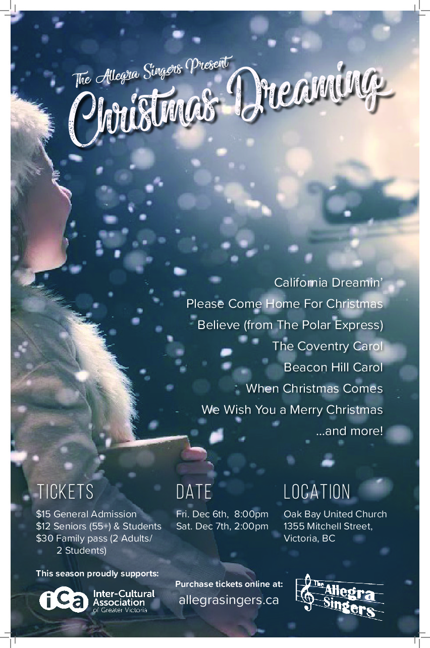 Allegra Singers Winter Concert Beautiful music. Fun songs. Rhythms that stir your soul. Music that brings back memories. The Allegra Singers will inspire you, move you, soothe you and entertain you. If you’ve never seen the Allegra Singers you’re in for a treat! Concert Dates: 6 December, 2019 at 8:00pm 7 December, 2019 at 2:00pm Location: Oak Bay United Church Cost: $12 - $15 Website/Contact: www.allegrasingers.ca/concerts