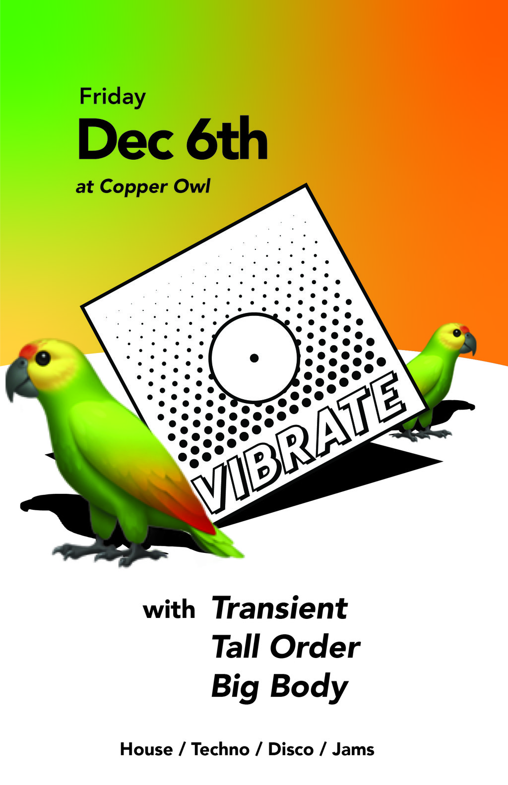 We're very excited to host another night of dancefloor ready house jams, some deeeeep disco cuts, and fluid melodies. Transient, Tall Order and Big Body are taking over Copper Owl for a night of disco edits, house anthems, techno, acid, brain dance, body dance, and whatever the heck else we feel like playing. You don't want to miss this one, it will be one for the books.