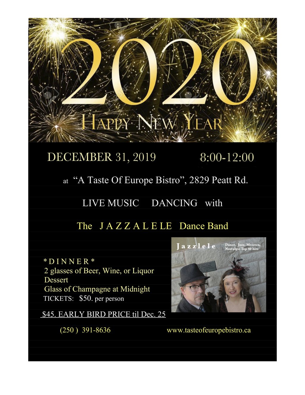 New Years Eve with JAZZALELE! December 31st 2019, join us for a lovely New Years Eve dinner and dance, locally at "A Taste Of Europe", 2829 Peatt Rd at Goldstream. Entrepreneur Chef Chris Zmuda is planning the meal and an event with all the trimmings. You will enjoy an unforgettable feast, accompanied by 2 glasses of wine, beer, or liquor, dinner, dessert, live music, and at midnight, a champagne toast. Cost is $50. per person, but if you purchase tickets before Christmas, they are only $45. each. We hope to bring in the New Year together with all of our friends...Check it out! CALL (250 ) 391-8636