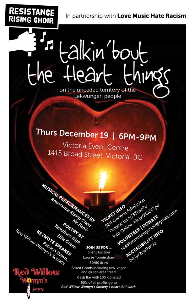 The Resistance Rising Choir, in partnership with Love Music/ Hate Racism, will be “Talkin’ bout the Heart Things” at their second annual winter concert. The Resistance Rising Choir’s a capella activist anthems will be interspersed in a powerhouse line up featuring: