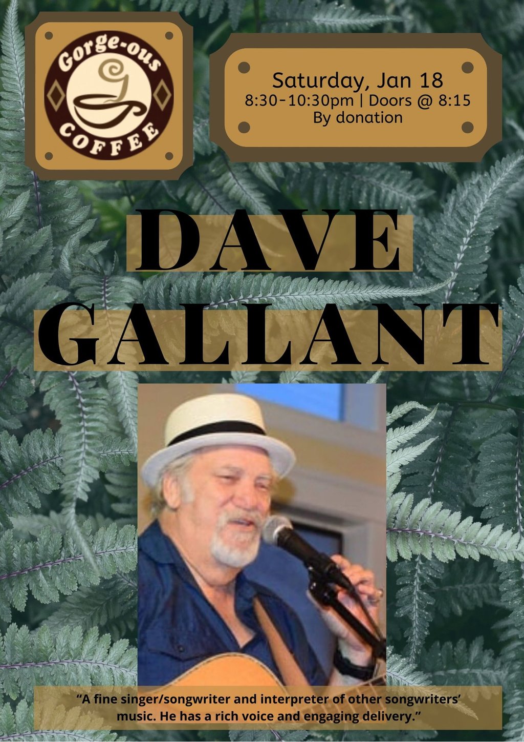 “A fine singer/songwriter and interpreter of other songwriters’ music. He has a rich voice and engaging delivery.” - from davegallant.com