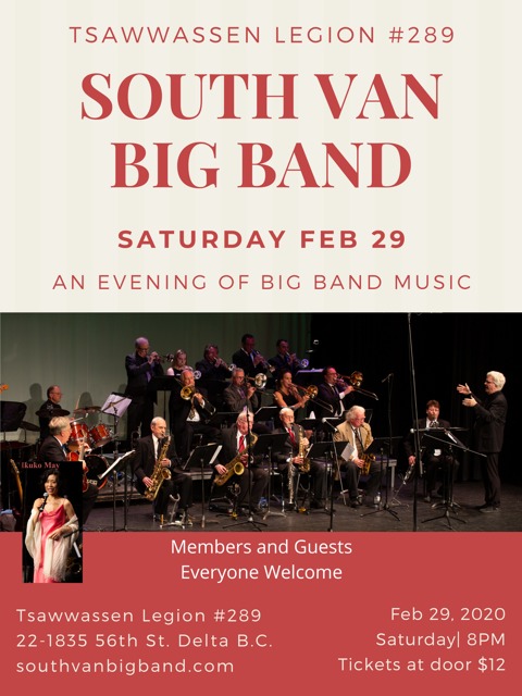 Big Band Jazz at the Legion: South Van Big Band @ Royal Canadian Legion #289 Tsawwassen BC Feb 29 2020 - Jan 12th @ Royal Canadian Legion #289 Tsawwassen BC