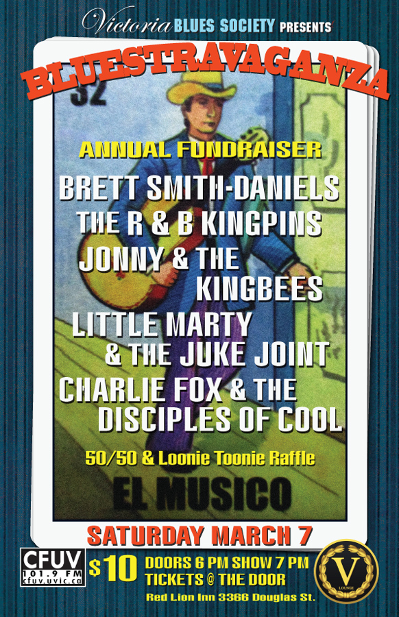 The Victoria Blues Society's next event is our fundraiser on Saturday March 7th - Bluestravaganza - 5 bands for 10 bucks! All funds raised go towards the John Fisher Memorial Legacy Fund. This fund provides education and training opportunities for aspiring blues musicians. In 2020, this fund is sending two students to Hornby Island Blues Camp. For the first time we are having a LOONIE/TOONIE draw where you pay a loonie or toonie for a chance to win a great item. WE ARE LOOKING FOR DONATONS OF ITEMS. If you have an item to donate please contact Deb at