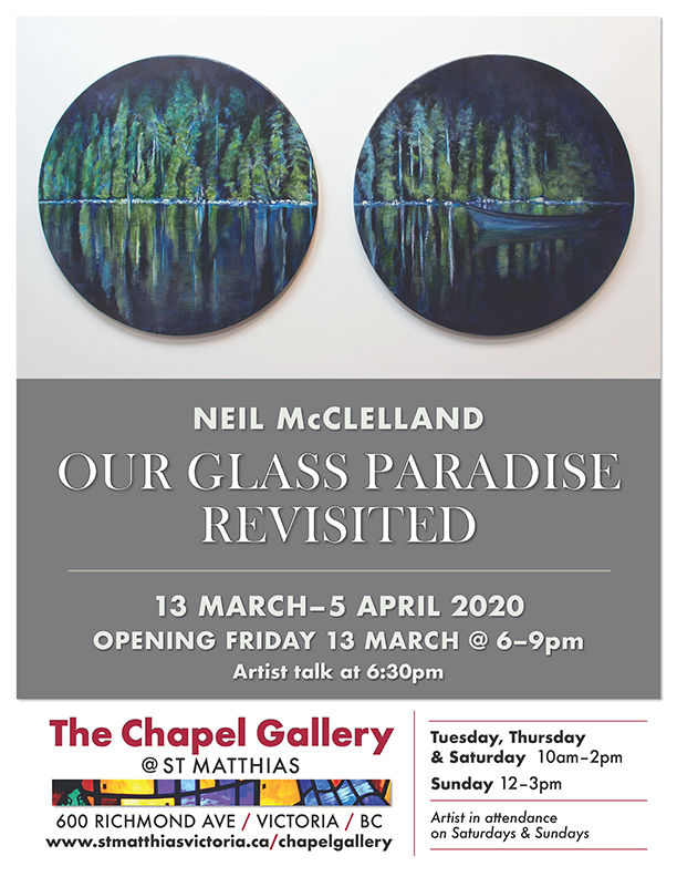 Victoria painter Neil McClelland explores human relationships to the natural world and the illusory nature of the paradises we seek in “Our Glass Paradise Revisited.” The exhibition opens at the Chapel Gallery March 13th at 6pm, artist talk 6.30pm and continues through April 5th. Gallery open Sat & Thurs 10-2 & Sun 12-3. Artist in attendance on Saturdays and Sundays.