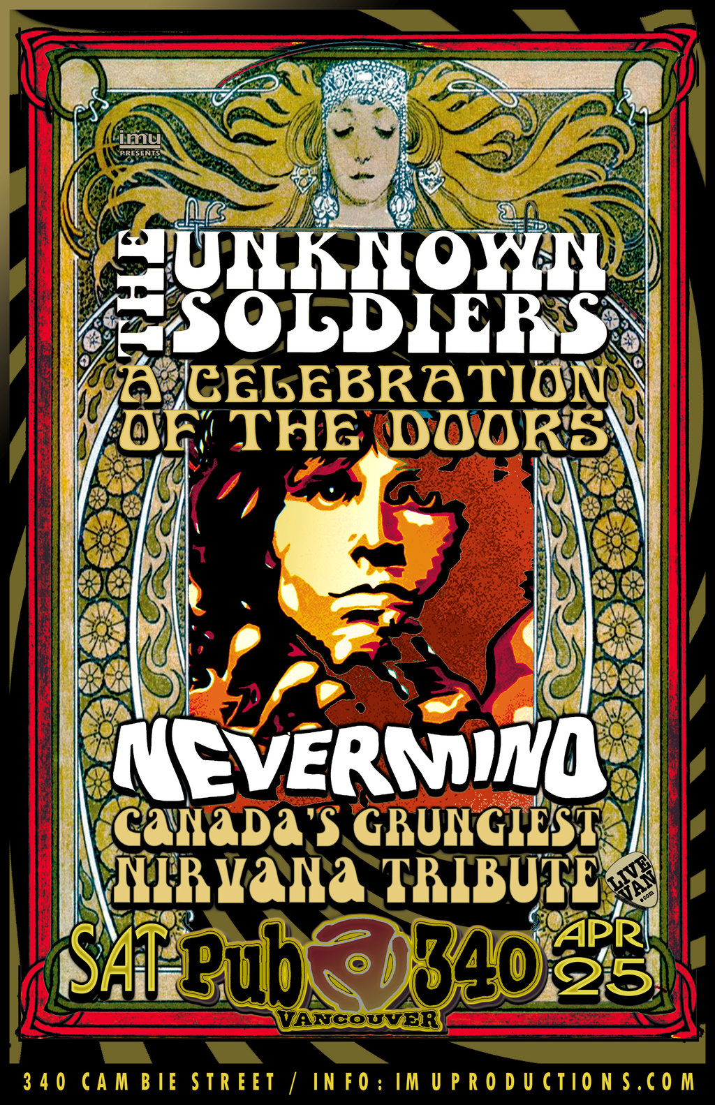 Saturday, April 25th ~ The UNKNOWN SOLDIERS: A Celebration Of The Doors & NEVERMIND Nirvana Tribute @ Pub 340, 340 Cambie Street. Show 9:30pm / $10 cover