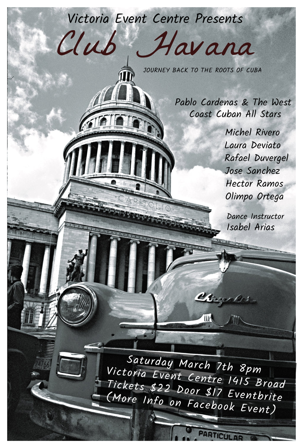 Doors 8pm, dance class 8:15, Show 9:15, performance 10:15, Dj from 12am to 2am (playing all Latin rhythms, Salsa, Bachata, and more). Tickets $22 at doors, $17 eventbrite. March 7th, Victoria Event Centre, 1415, Broad St, Victoria, BC