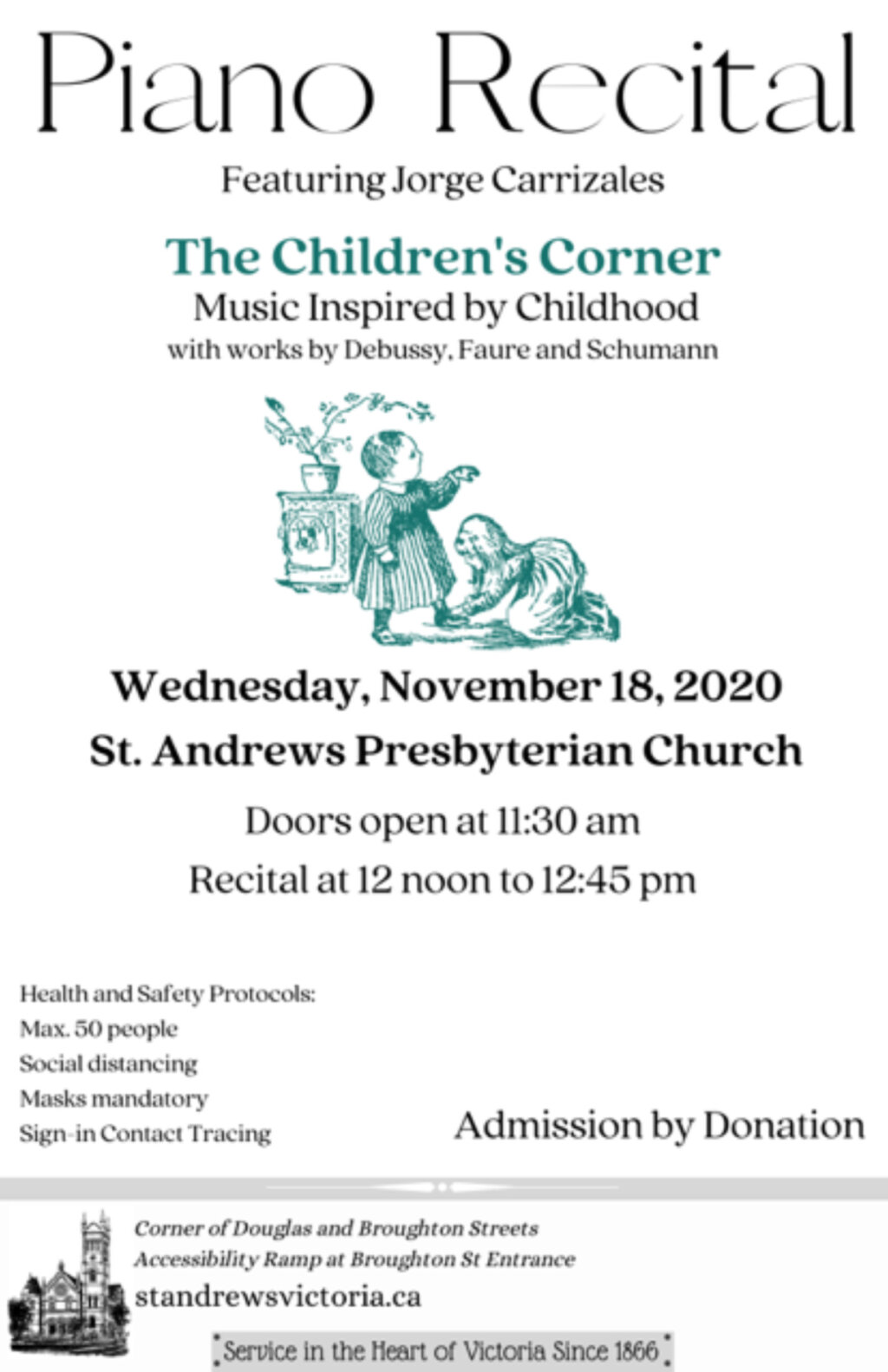 Jorge Carrizales, who holds a Masters in piano performance from University of Victoria, presents a noon hour recital titled “The Children’s Corner” including pieces by Debussy, Faure and Schumann. Doors open at 11:30 and the recital is from 12:00 to 12:45pm. Wednesday, November 18, 2020.St. Andrew’s Presbyterian Church in Victoria, is located at 924 Douglas St., between Courtney and Broughton Streets, with wheelchair access from 643 Broughton St. Admission is by donation for maximum 50 persons and Covid safety protocols will be followed.