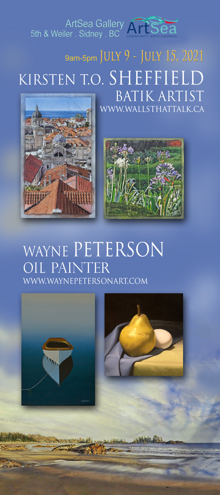 With his crisp, clear use of oils, Wayne Peterson reflects things that he is touched by as he expresses his love of Nature and the world at large. Kirsten Sheffield, through her Westcoast and travel imagery, manipulates wax and dye, merging realism and the fluid nature of water in her Painted Batiks. They both invite and welcome you to their show, a “Chance” for that “Glance” to linger in your mind, and possibly on your wall!