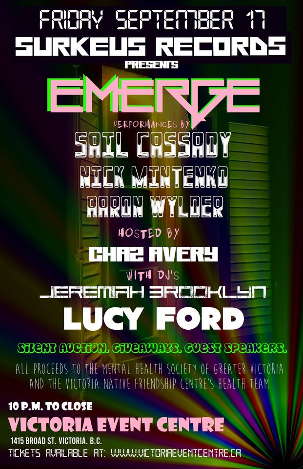 Join us at Victoria Event Centre on Friday September 17th for EMERGE, a night of music, magic, wonder and spectacle. With performances by: Sail Cassady, Nick Mintenko, Aaron Wylder. Chaz Avery will be hosting the event, and Dj's jeremiah brooklyn and Lucy Ford will be spinning beats from our new electronic compilation to close the night out!