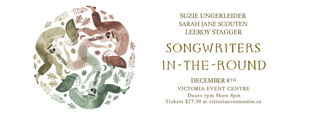 Sarah Jane Scouten, Leeroy Stagger and Suzie Ungerleider are each uniquely talented Canadian songwriters whose combined achievements include multiple world tours, Juno nominations, Canadian Folk Music Awards and several studio recordings.
