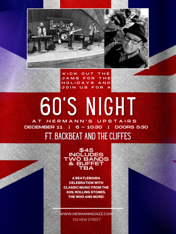 A holiday kick-off with jams celebrating Beatlemania and other fabulous music from the 60's; all the classics you love including Rolling Stones, the Who and more! Performed by only the best: Backbeat and The Cliffes on a double bill.