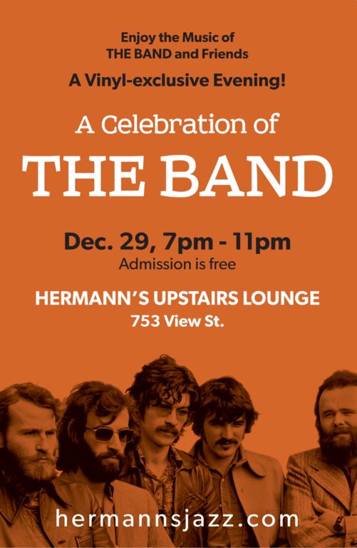 A vinyl-exclusive evening! Enjoy the music of THE BAND and Friends at Victoria's hip new lounge, Hermann's Upstairs. Entrance is free!