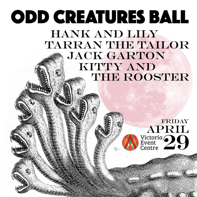 A night of dreams and dancing, a night of unlikely animals and untold tales. Tarran the Tailor, Jack Garton, Kitty and the Rooster, and the resplendent reunion of Hank Pine and Lily Fawn (oh my!) will bring music and revelry to the VEC on Friday April 29. An entire festival in one night, this one’s for all you Odd Creatures, and your loved ones.