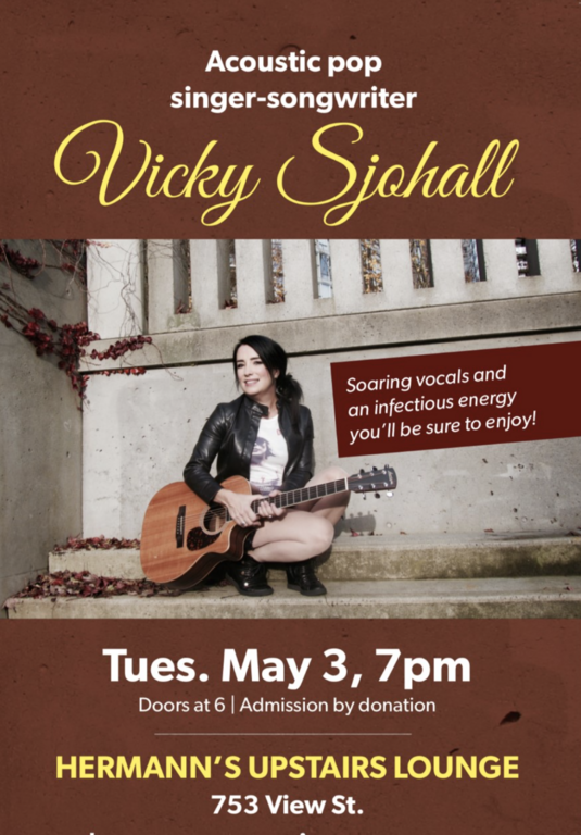 Vicky Sjohall is a powerful singer-songwriter from Vancouver BC. She has infectious great time energy and an amazing voice. We look forward to her Hermann's debut.