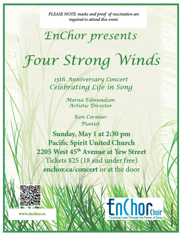 Life is good. Choirs are back singing together and we at EnChor Choir have much to celebrate. We invite you to come share the joy of our music-making on Sunday, May 1 at 2:30pm when we present Four Strong Winds, Celebrating Life and Song.