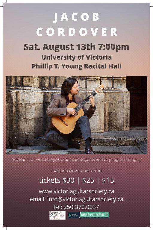 The Victoria Guitar Society is pleased to present classical guitarist Jacob Cordover in conjunction with the Victoria Conservatory of Music's Summer Intensive Program - Guitar.