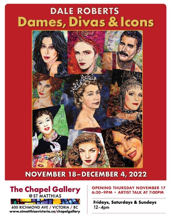 The Chapel Gallery at St. Matthias Church celebrate the Advent season with the Dames, Divas and Icons Exhibition which so uniquely demonstrates the changing from the Dark to the Light; the transformation and acceptance of each of us as unique and unlimited souls who flourish within the creative and public realms. The personalities Dale has chosen to represent have each broken barriers, exposed themselves and challenged societal norms in the process of developing their icon statuses. Dale’s interpretation of these individuals has been built on research, correspondence, and relationships he has forged over the decades to realize aspects of their journeys.