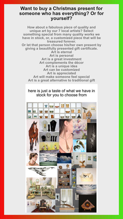 How about a fabulous piece of art by a local artist? Select something special from many quality works we have in stock, or, a customized piece that will be treasured forever.