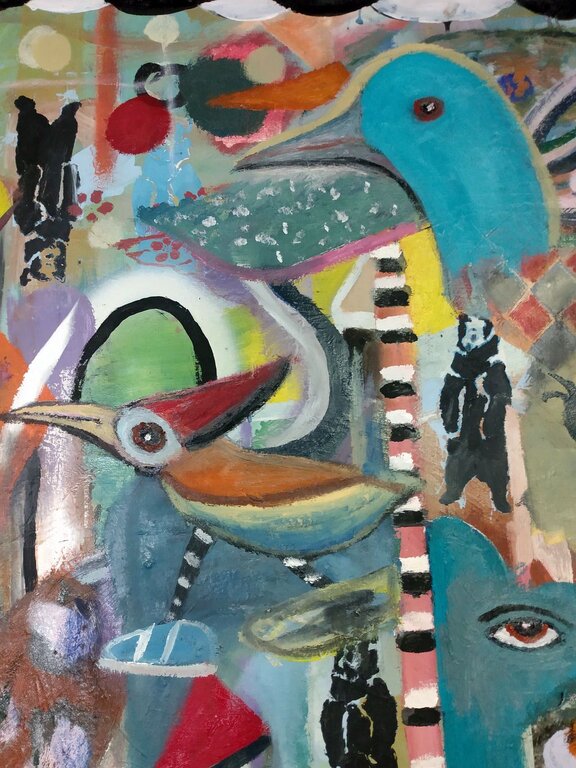 Forest of Signs is a painting installation by Victoria artist Roy Green. In these works figurative elements collide with abstract forms of mark-making , creating a reservoir of painterly pleasure and provocation. The multiple layers of acrylic, oil and spray paint are an analog response to living in a digital world. Roy Green has exhibited his work internationally, has received several grants and awards and currently resides in the Humboldt Valley.