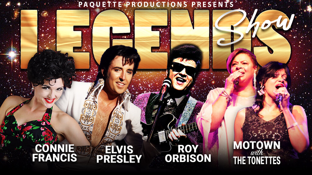 "Legends Show" brings you some of North America's most outstanding performers live on stage. Accompanied by the Rockin' Royals Band and The Tonettes, this show will feature the most incredible Tributes to Roy Orbison (Jesse Aron), Connie Francis (Amberley Beatty), the music of Motown (The Tonettes), and Elvis Presley (Pete Paquette).