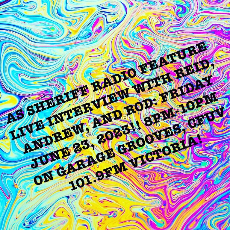 AS SHERIFF RADIO FEATURE LIVE INTERVIEW WITH REID, ANDREW, AND ROD: FRIDAY JUNE 23, 2023!! 8PM-10PM ON GARAGE GROOVES, CFUV 101.9FM VICTORIA!