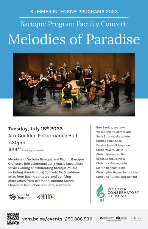 Members of Victoria Baroque and Pacific Baroque Orchestra join celebrated early music specialists for an evening of exhilarating baroque music, including sublime arias and Brandenburg Concerto No.5 by Bach, and uplifting discoveries from Telemann, Barbara Strozzi, Elisabeth Jacquet de la Guerre, and Agostino Steffani.