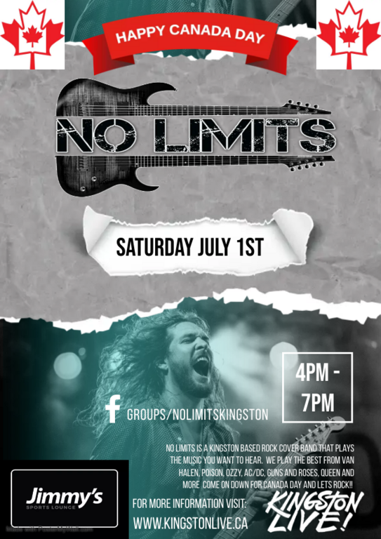Let's rock this Canada Day 🇨🇦 with No Limits! We are a Kingston based rock cover band that plays the songs you want to hear. We play the best from Van Halen, Poison, Ozzy, AC/DC, Guns and Roses, Queen, and more. Head on down and let rock this town. 🤟