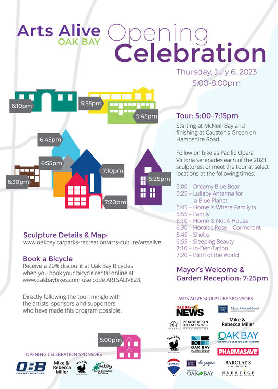 Receive a 20% discount at Oak Bay Bicycles when you book your bicycle rental online at www.oakbaybikes.com use code ARTSALIVE23.