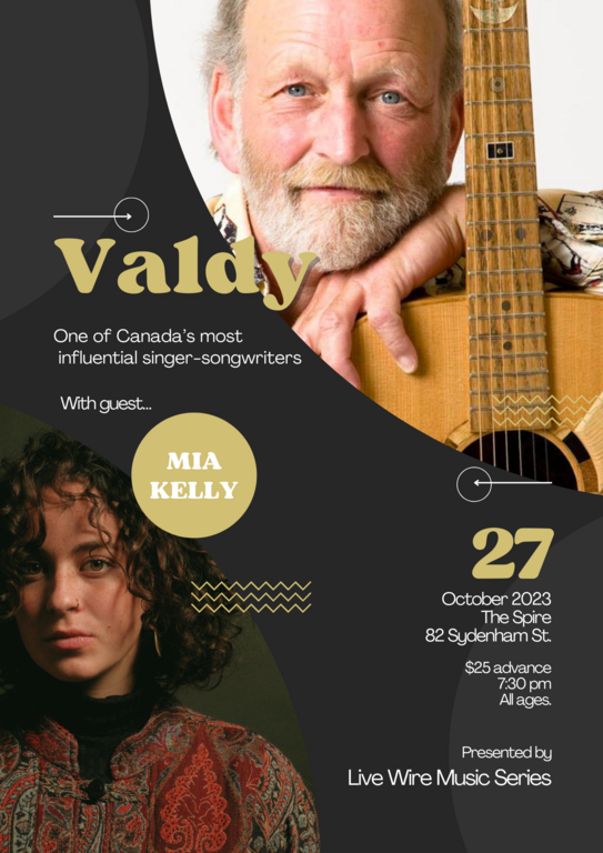 Live Wire Music Series is honoured to welcome back Canadian legend Valdy to our stage for the second concert in our series on October 27. One of Canada's most influential singer-songwriters with 22 albums, 22 singles and 4 Gold Records, Valdy will be playing hits from his long and storied career such as Play Me a Rock and Roll Song, Peter and Lou, Yes I Can, as well as new material – even a song about Queen Elizabeth! It has been over 10 years since Valdy played a memorable Live Wire concert at Chalmers Church and we are thrilled to have him back, this time at The Spire.