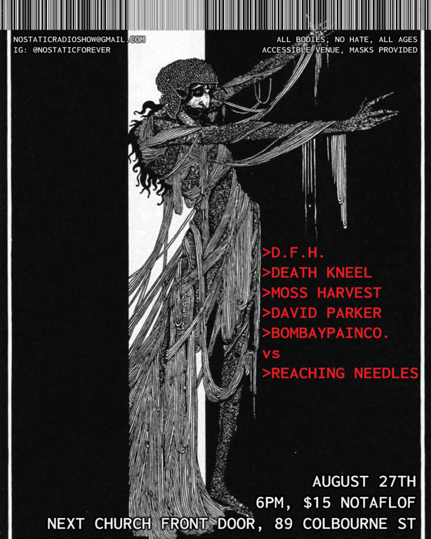 Shock, awe, and absolute noise. Microtour from grinders and heavy hitters Death Kneel (@mkleb___), Moss Harvest (@mossharvest), and D.F.H. (@grindcog). In addition to this! R/N (@reachingneedles) will be performing under the weaponized tattoo gun of @bombaypainco. Lastly, local champion, friend and ally of NO STATIC, and (h)EAR Kingston (@hear.kingston) member DAVID PARKER (@slowmantofu) will be unveiling harsher sounds and entering less explored territories in their performances.