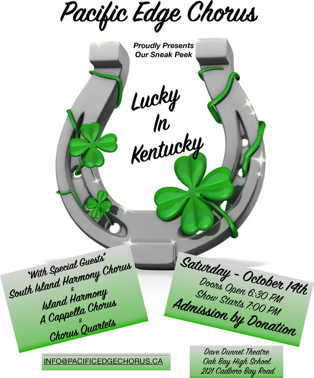 Pacific Edge Chorus is a spirited singing group that truly embraces the vocal artistry and technical expertise of a cappella four-part harmony. The public is invited to their Sneak Peek show, “Lucky in Kentucky”. Admission is by donation. Doors open at 6:30, show at 7:00.
