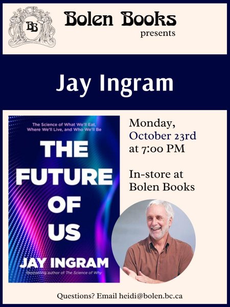 Join us this fall as science author and broadcaster Jay Ingram returns to Bolen Books to present his newest book, THE FUTURE OF US, in conversation with the host of CBC Radio’s Quirks & Quarks, Bob McDonald. THE FUTURE OF US covers some of the latest and most talked about topics in science and technology, and gives readers a glimpse into the future of every aspect of human life. This event is for fans of CBC's Quirks and Quarks, those who want to take a look at the future of “us,” and anyone who has ever asked, 'Why?'