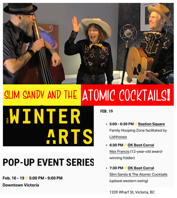 Boogie with Slim Sandy's Atomic Cocktails, and their 40s jive music, at their pop up show, as part of the 2024 Victoria Winter Arts Festival. 7:30-8:45 pm. Free entry!