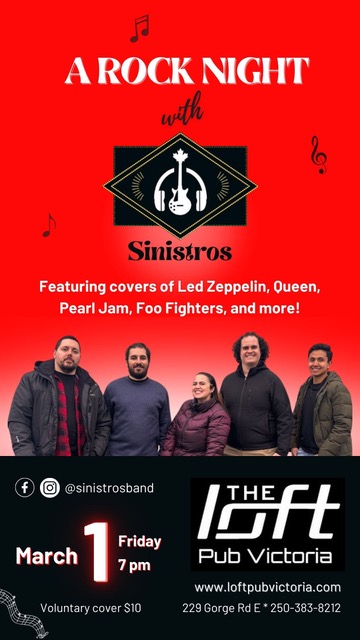 Born from a shared love for music, Sinistros crafts a journey from classic legends to contemporary hits. This Brazilian and Rock band is based in Victoria, BC, and embodies a diverse range of styles such as rock and pop, featuring covers by Led Zeppelin, Deep Purple, The Beatles, Foo Fighters, and others! Join Ana (Vocals), Guilherme and Armando (Guitar), Marcos (Bass), and Adrian (Drums) in a sonic experience. Voluntary Cover $10.