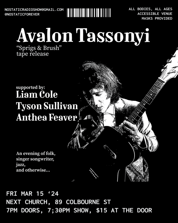 Friday March 15th, $15 NOTAFLOF show at 7;30. Folky jazzy singer songwriter-y show with headliner Avalon Tassonyi (@avalontassonyi) off the back of their most recent release ๐ข๐น๐ป๐ฒ๐ฐ๐ผ & ๐๐ป๐พ๐ผ๐ฑ !
