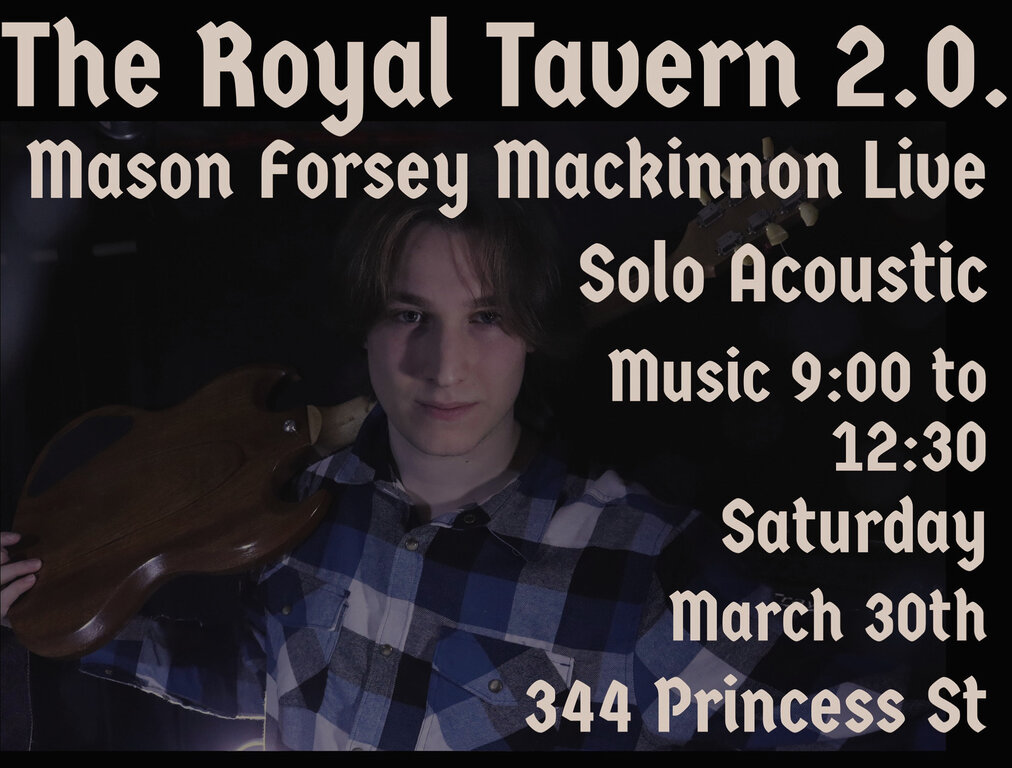 Local, Rock-based, singer songwriter Mason Forsey Mackinnon will be hitting the new stage at The Royal Tavern 2.0. this Saturday night at 9:00PM. He’ll be playing a set of rock classics and original songs so come out for some fun there’s no cover!