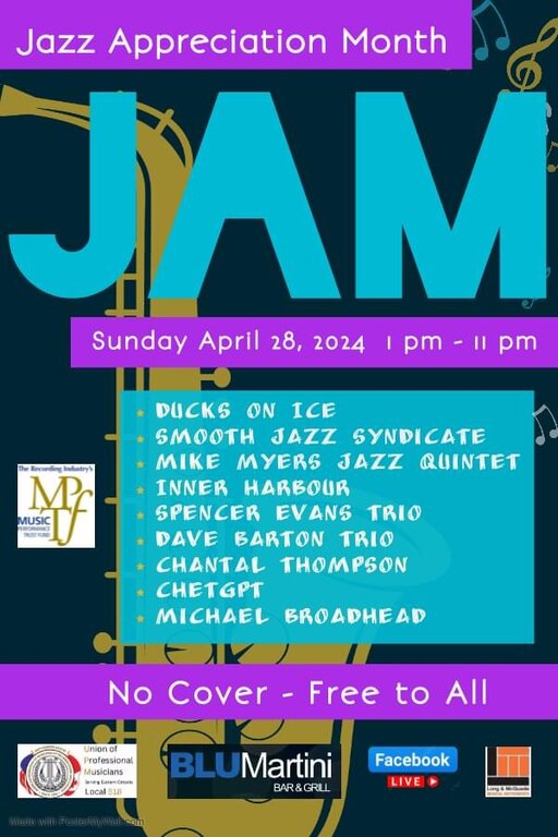 Carl Merenick, Sean Hully, Michael K. Myers, Inner Harbour Jazz, Spencer Evans, Dave Barton, Chantal Thompson, Michael Broadhead, ChetGPT @ Blu Martini Apr 28 2024 - Feb 10th @ Blu Martini