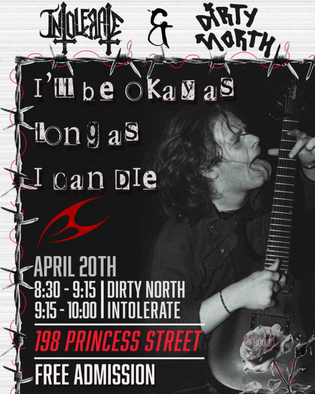This Saturday (april 20th) local metal band INTOLERATE and hip-hop group DIRTY NORTH will be playing at 198 Princess St (old frameworks downtown kingston) as part of Francisco Corbetts solo art show “I’ll be ok as long as i can die.”