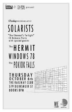 Thursday, Oct 6th IMU & CiTR present Solarists CD Release Party with The Hermit, Windows 78 & The Pokiok Falls @ The RAILWAY CLUB, 579 Dunsmuir Street . Doors 8pm / $10 -:- Info: 604 681 1625