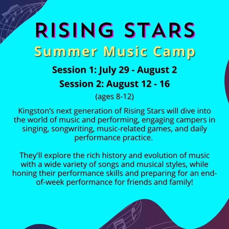 Get ready, because Kingston’s next generation of Rising Stars are on its way! During this week-long program, campers will dive into the world of music and performing through singing, songwriting, music related games, and daily performance practice. Each day, these Rising Stars will explore a different facet of the rich history and evolution of music, including a wide variety of songs and musical styles.