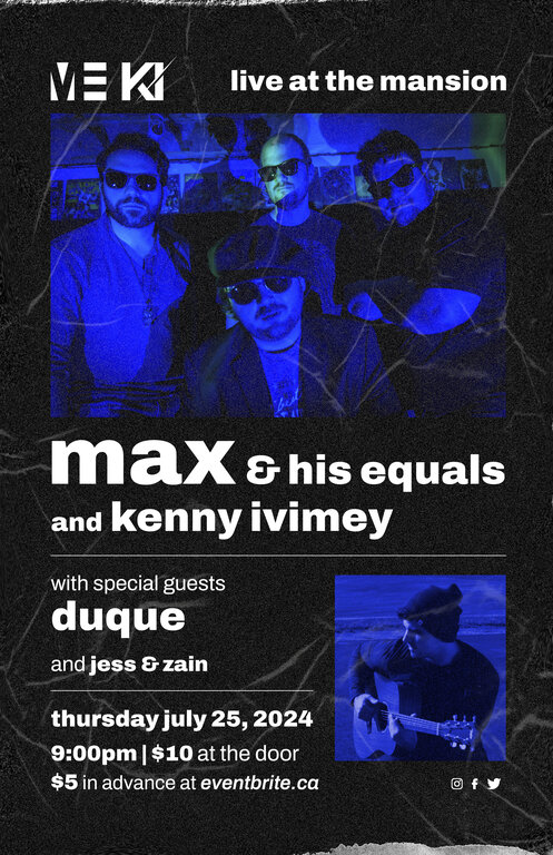 Come join us for a night of amazing live music at The Mansion Restaurant & Bar! Get ready to groove to the rockin' tunes of Max and His Equals, and Duque, as well as the singer-songwriter acoustic sets of Kenny Ivimey, and Jess and Zain. It's going to be a night to remember with great performances and good vibes all around. Don't miss out on this epic lineup!