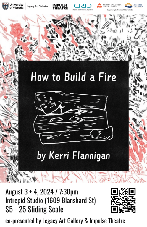 Co-presented by Legacy Art Gallery and Impulse Theatre, How To Build a Fire is a performance accompanied by projections, sound and live-narration. Connections to nature, changing climates and wildfire are explored through the relationship between Kerri, the performer, and their father Mike, a fire scientist. This performance asks questions about what kind of relationships we should have with each other, with fire, and with the land around us.