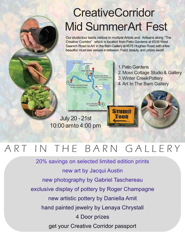 Our studio tour leads visitors to multiple Artists and Artisans along “The Creative Corridor” which is located from Patio Gardens at 6536 West Saanich Road to Art in the Barn Gallery at 4578 Hughes Road, with a few beautiful must-see venues in between. Food, beauty, and prizes await!