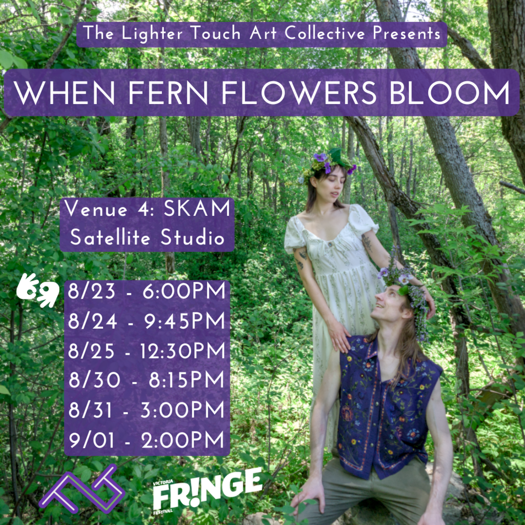 When Fern Flowers Bloom is a tale of love, loss, and transitions told through traditional Latvian folklore, poetry, and symbolism. Nāve, the Goddess of Death, has just received word that Fall is coming but struggles to follow through with her responsibility when she discovers that the time has also come for her lover Jāņis, the incarnation of Summer and its Solstice celebration. Over the course of one last intimate date night, we see how each character processes and finally accepts their fate by either holding on to their traditions or creating new ones.