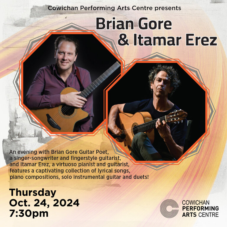 An evening with Brian Gore Guitar Poet, a singer-songwriter and fingerstyle guitarist and Itamar Erez, a virtuoso pianist and guitarist, features a captivating collection of lyrical songs, piano compositions, solo instrumental guitar and duets!