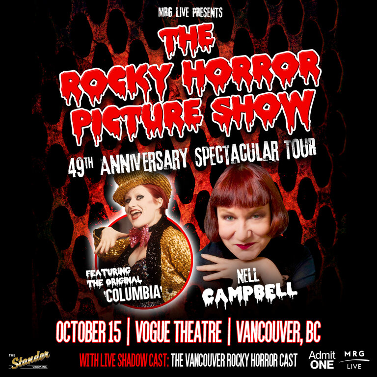 Join the original 'Columbia' - NELL CAMPBELL - for a screening of the original unedited movie with live shadow cast: The Vancouver Rocky Horror Cast and audience participation! Plus a costume contest, and more! *Get exclusive tickets to the V.I.P. Meet & Greet to meet Nell Campbell herself, have a personal photo opportunity, & get an autograph.