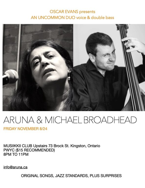 Local musicians Aruna and Michael Broadhead play original tunes and jazz standards in a voice and bass setting.
