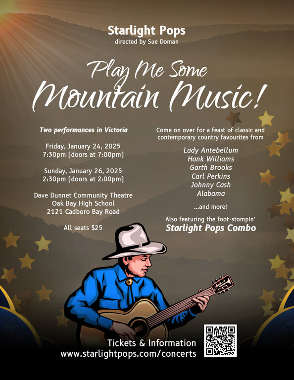 Starlight Pops, Victoria's fabulous pops choir directed by Sue Doman, is thrilled to present "PLAY ME SOME MOUNTAIN MUSIC!" at the Dave Dunnet Community Theatre. Come on over for a feast of toe-tapping tunes and harmonious melodies that will transport you to the heart of the mountains. Featuring music by Alabama, Garth Brooks, Lady Antebellum, Hank Williams, Johnny Cash, Patty Loveless, Carl Perkins and more, our talented performers will serenade you with a mix of classic and contemporary country tunes that will have you clapping and singing along. Also featuring the toe-tappin' Starlight Pops Combo. Don't miss out on this unforgettable afternoon of music and community. Get your tickets now!